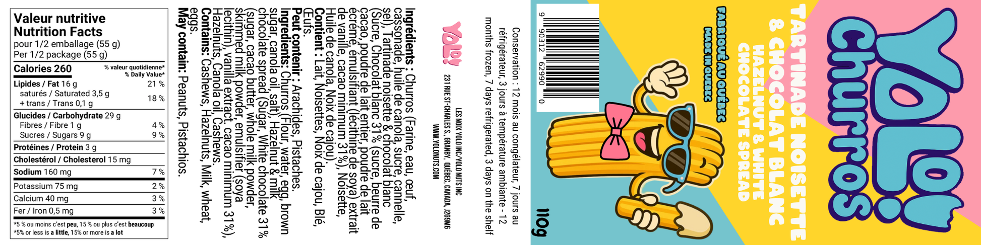 Ingrédients : Churros (farine, eau, oeuf, cassonade, huile de canola, sucre, cannelle, sel), Tartinade (sucre, chocolat au lait 35% (sucre, beurre de cacao, poudre de lait entier, liqueur de cacao, crème en poudre, lécithine de tournesol, extrait de vanille, sel), noisettes, huile de canola, noix de cajou). Contient : Lait, Noisettes, Noix de cajou, Blé, Oeufs. Peut contenir : Arachides, Pistaches.
